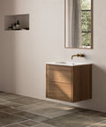 Det 60 cm brede badeværelsesmøbel har et rummeligt underskab med 2 push open skuffer til opbevaring af dine badeværelsesartikler. Elegant Solid Surface bordplade med integreret håndvask, som giver et stilrent og sammenhængende udtryk.
