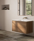 Det 100 cm brede badeværelsesmøbel har et rummeligt underskab med 2 push open skuffer til opbevaring af dine badeværelsesartikler. Elegant Solid Surface bordplade med integreret håndvask, som giver et stilrent og sammenhængende udtryk.